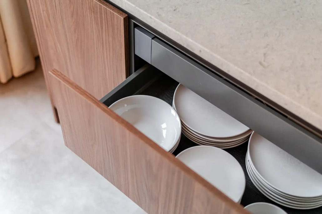 Volgens Johan werd er ook veel aandacht besteed aan praktische elementen: “Babs stelde voor om één natuurstenen blad te laten vervallen en daar extra kastruimte te maken door middel van een grote kastenwand. Daardoor werd het praktischer én zakte verrassend genoeg de prijs. Daarover gesproken: wij waren erg tevreden met de transparantie van Schalk. We gaven een richtlijn voor ons budget en daar bleven ze netjes binnen. Je wist heel goed waar je aan toe was en wat het zou kosten. Dat was echt een verademing.”