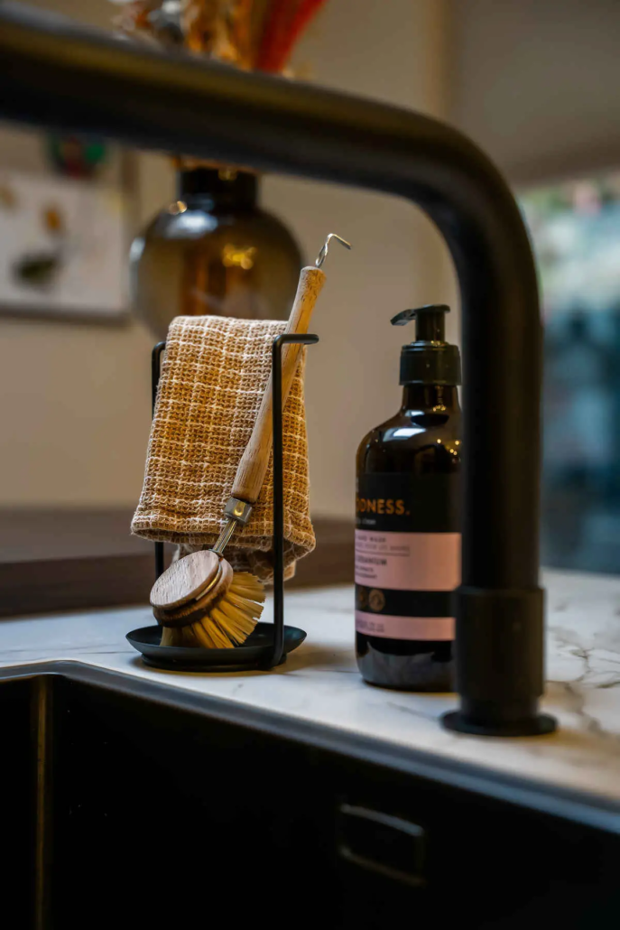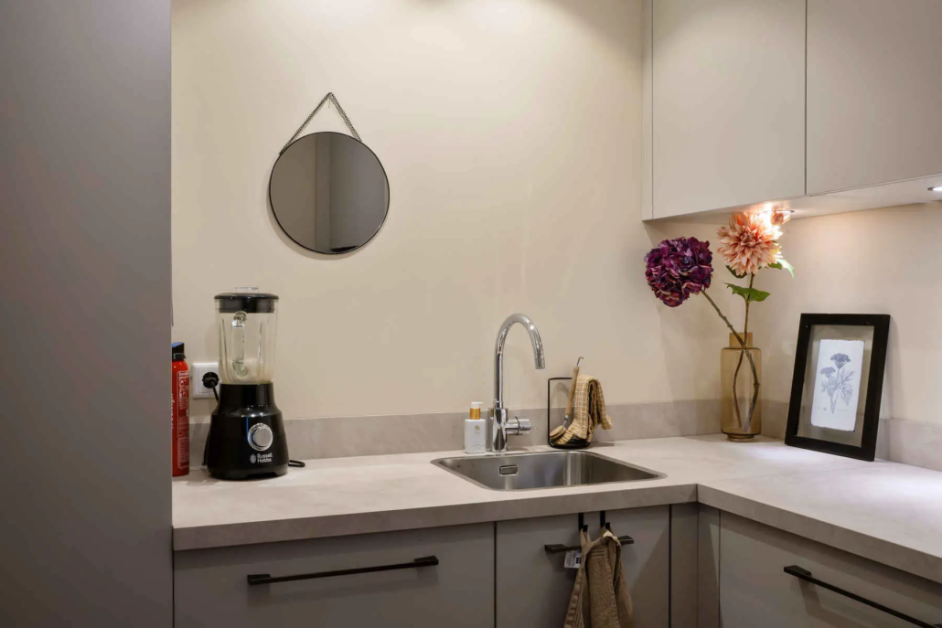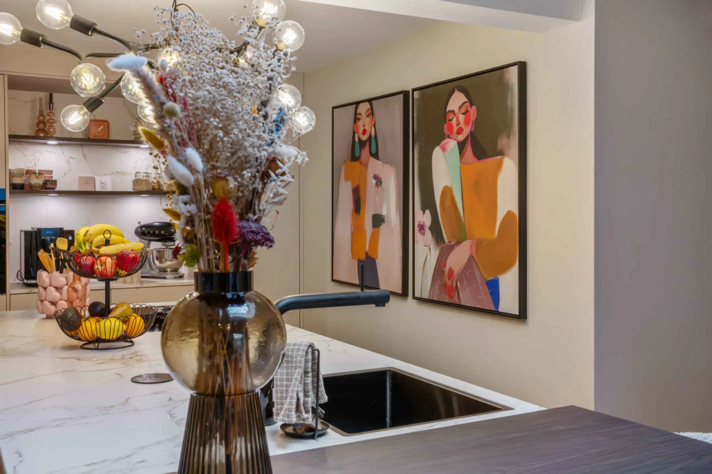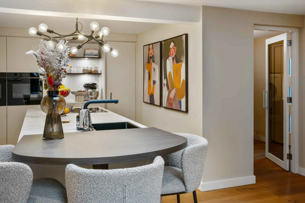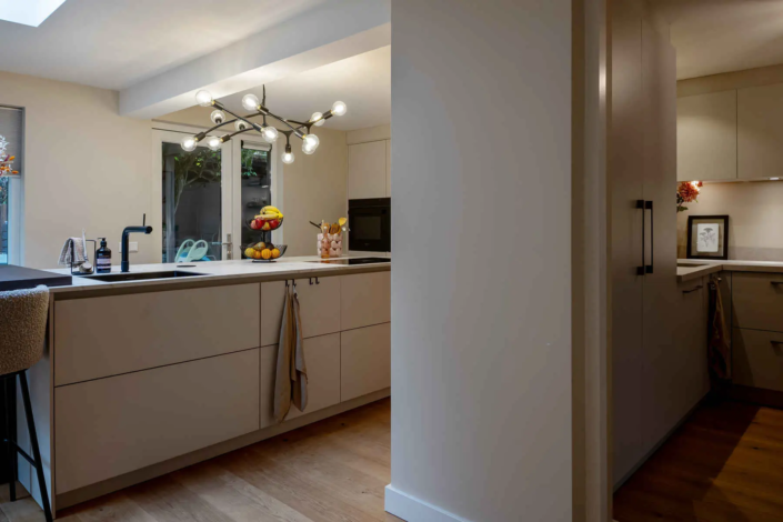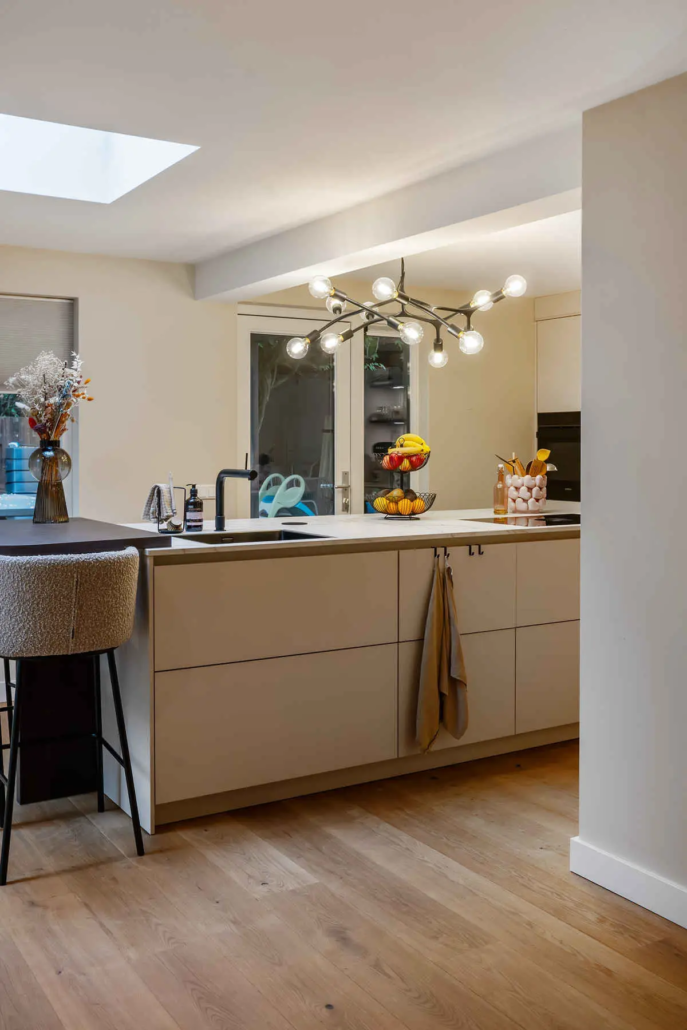 De combinatie van lichte kleuren, houtaccenten en subtiele details zorgt voor balans. “Bij een moderne keuken denk je snel aan wit en kil, maar dat is hier absoluut niet zo. De materialen zijn mooi op elkaar afgestemd. Zelfs de wasbak en de Quooker hebben een andere kleur dan standaard, wat het geheel extra karakter geeft.”