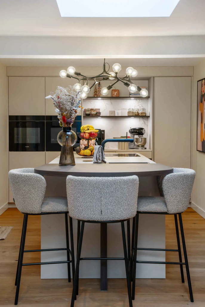 Het opvallendste onderdeel van de keuken is het barretje aan de zijkant van het kookeiland. “Dat is echt iets bijzonders. Het is helemaal op maat gemaakt en uitgedacht. Het keukenblad loopt door in de bar, waar ook plek is voor de koffiemachine. Het ziet er niet alleen mooi uit, maar is ook heel praktisch.”